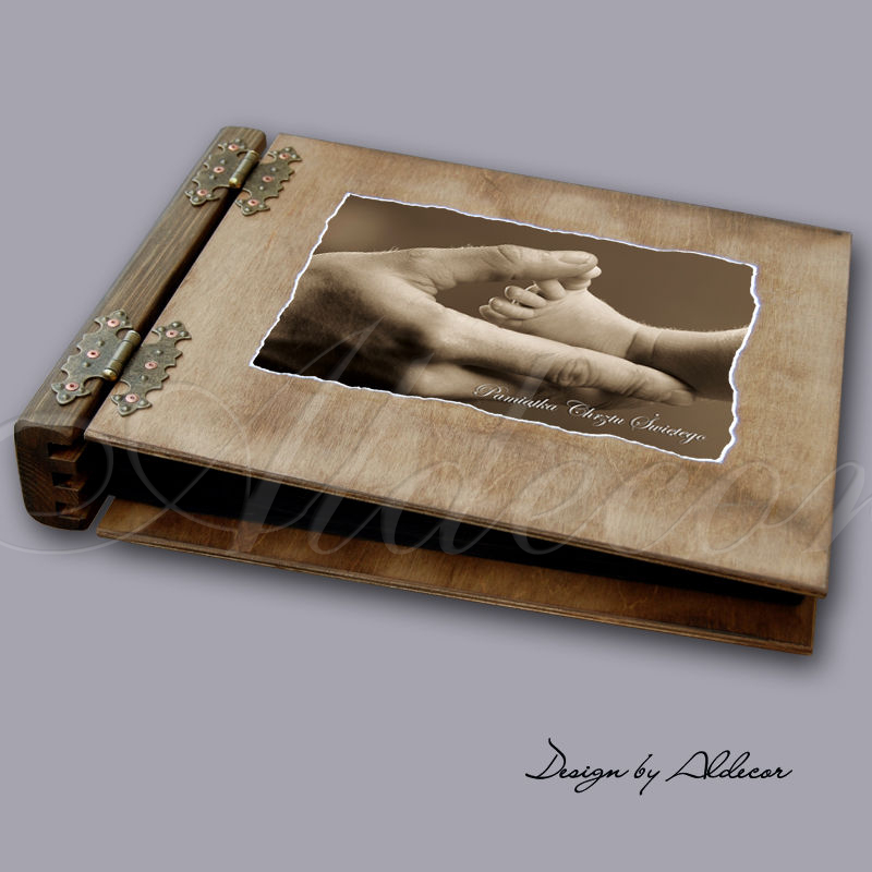 Album otwierany dwustronnie posiada drewnianą oprawę,grzbiet z litego drewna oraz cztery stylowe kute zawiasy. Wyróżnia się niepowtarzalnym wzornictwem, album wybarwiany za pomocą naturalnych wosków barwiących - kolor dąb rustical. Album cechuje się wysoką jakością wykonania oraz niepowtarzalnym zapachem jaki daje wosk.