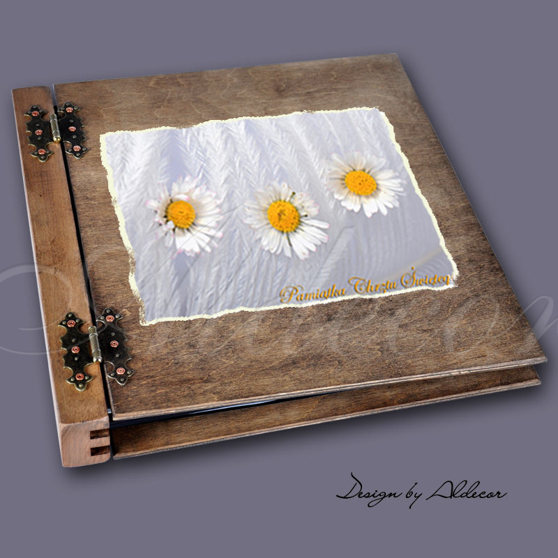 Album otwierany dwustronnie posiada drewnianą oprawę,grzbiet z litego drewna oraz cztery stylowe kute zawiasy. Wyróżnia się niepowtarzalnym wzornictwem, album wybarwiany za pomocą naturalnych wosków barwiących - kolor dąb rustical. Album cechuje się wysoką jakością wykonania oraz niepowtarzalnym zapachem jaki daje wosk.