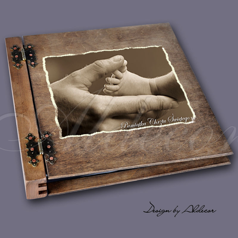 Album otwierany dwustronnie posiada drewnianą oprawę,grzbiet z litego drewna oraz cztery stylowe kute zawiasy. Wyróżnia się niepowtarzalnym wzornictwem, album wybarwiany za pomocą naturalnych wosków barwiących - kolor dąb rustical. Album cechuje się wysoką jakością wykonania oraz niepowtarzalnym zapachem jaki daje wosk.