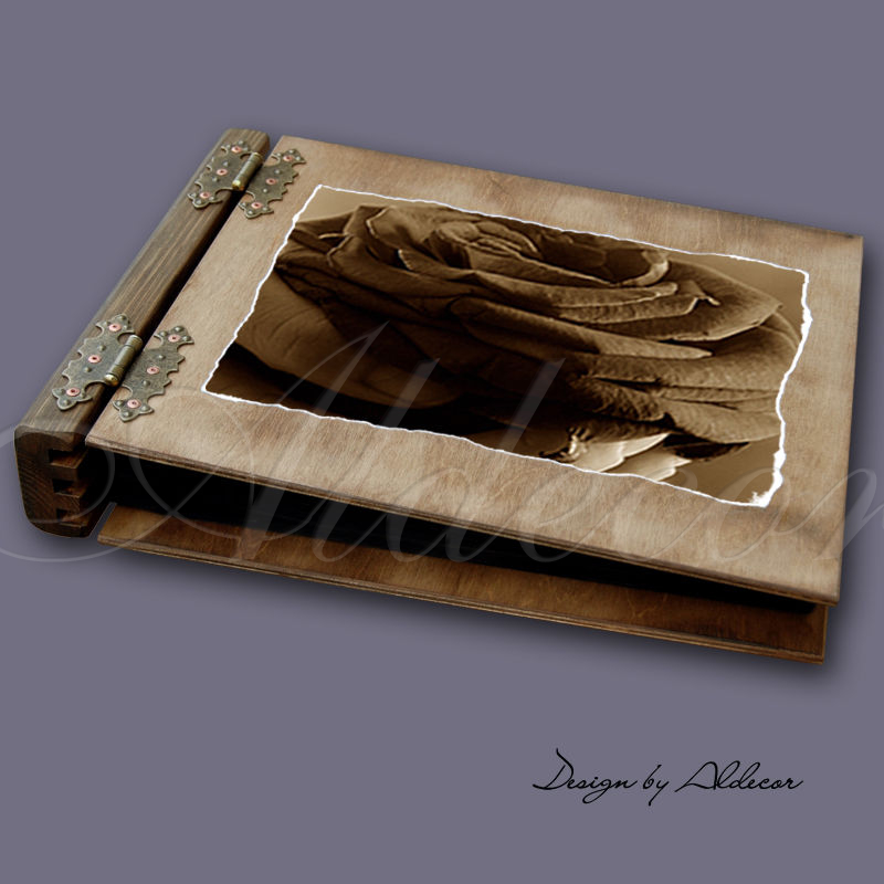 Album otwierany dwustronnie posiada drewnianą oprawę,grzbiet z litego drewna oraz cztery stylowe kute zawiasy. Wyróżnia się niepowtarzalnym wzornictwem, album wybarwiany za pomocą naturalnych wosków barwiących - kolor dąb rustical. Album cechuje się wysoką jakością wykonania oraz niepowtarzalnym zapachem jaki daje wosk.