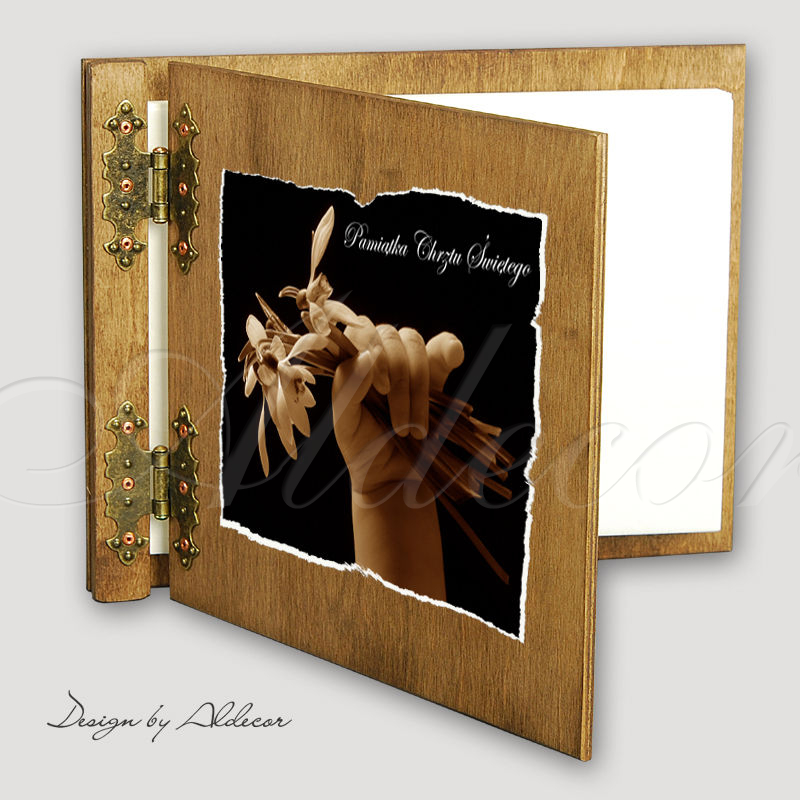 Album posiada drewnianą oprawę oraz stylowe kute zawiasy. Wyróżnia się niepowtarzalnym wzornictwem, album wybarwiany za pomocą naturalnych wosków barwiących - kolor dąb rustical. Album cechuje się wysoką jakością wykonania oraz niepowtarzalnym zapachem jaki daje wosk.